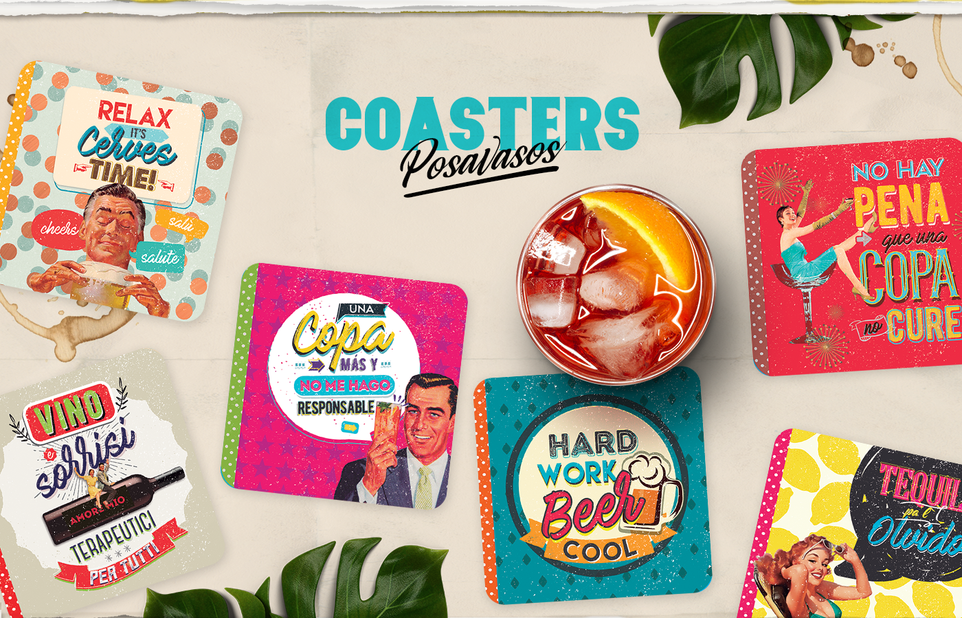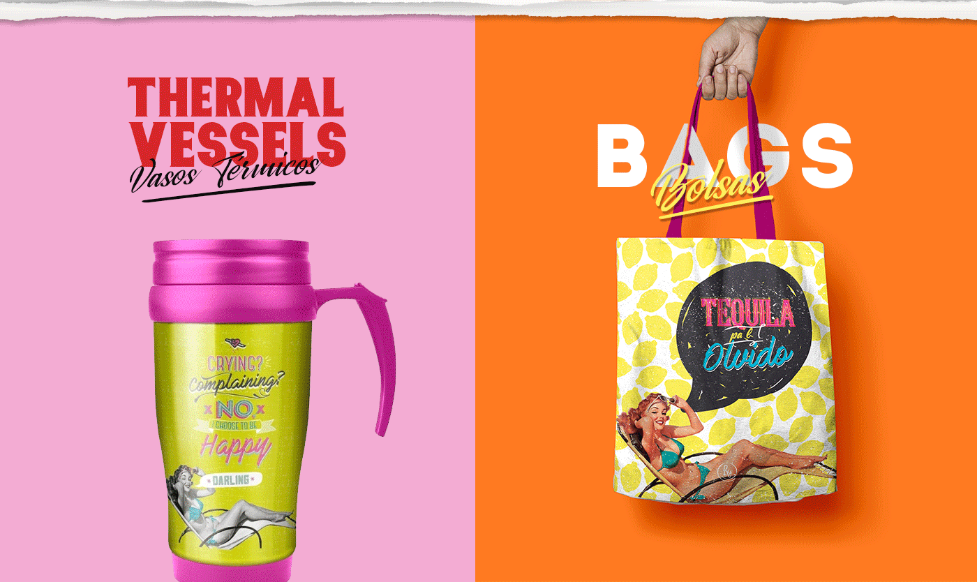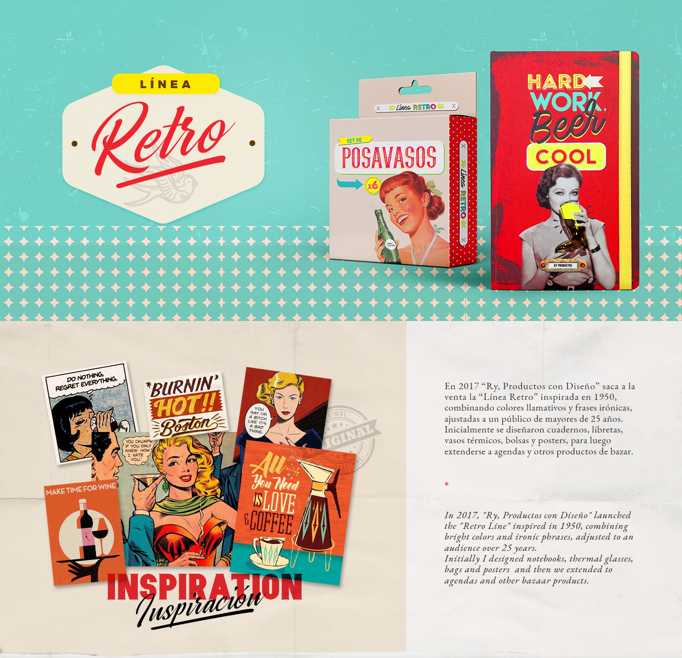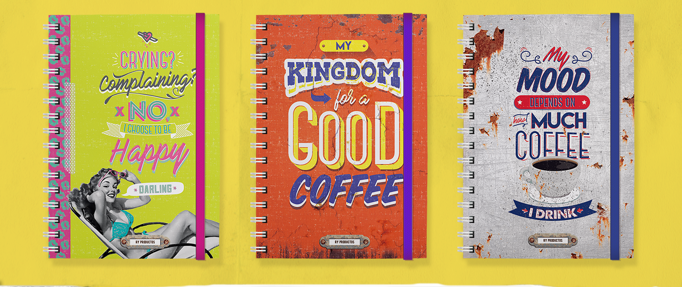Editorial design for a colection with a retro feeling. Notebooks, coasters and tote bags.